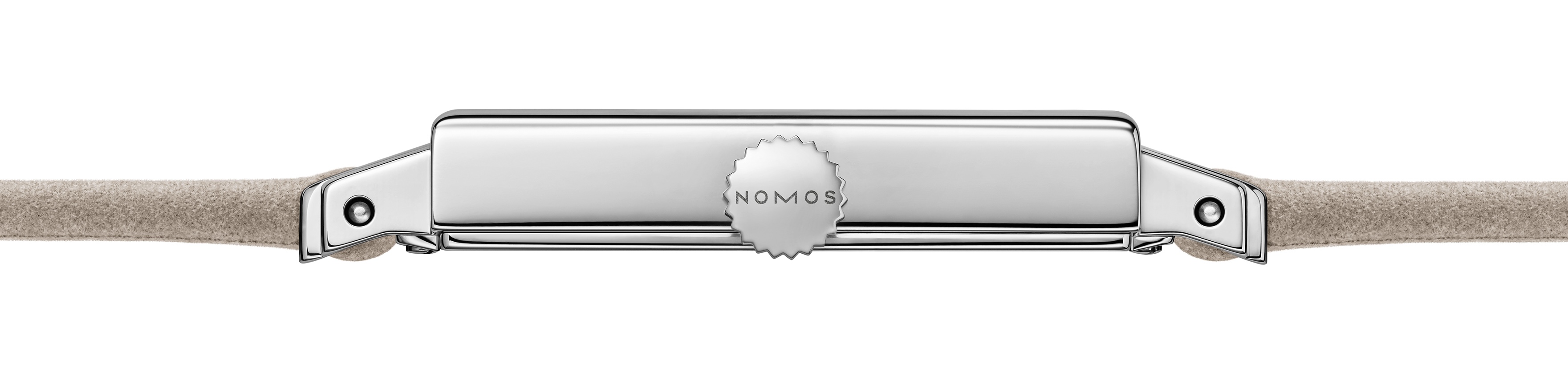29.5 mmのスクエアケースの内部で時を刻むのは、ノモス スウィングシステムを備える手巻き式キャリバー「DUW4001」。堅牢性、精度、信頼性を併せ持つこのキャリバーは、ノモスの多くの腕時計の内部で時を刻む。