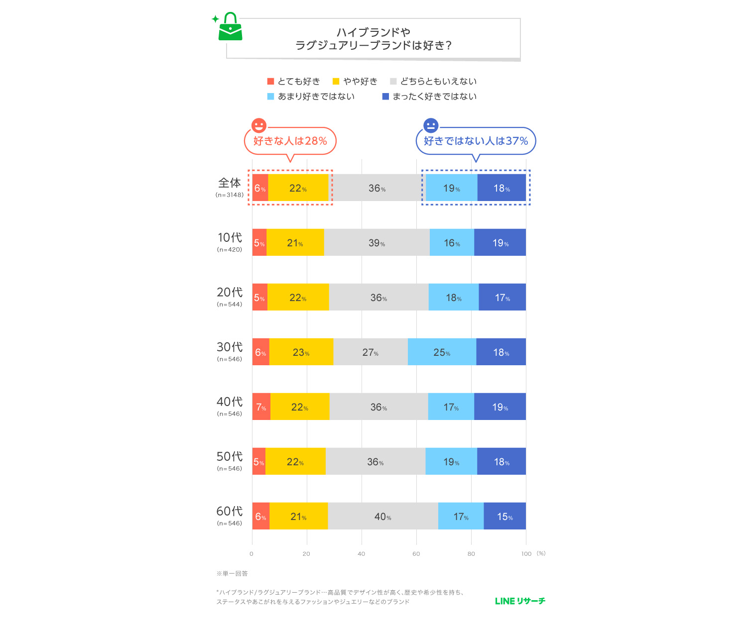 ハイブランドやラグジュアリーブランドが好きかどうかを聞いたところ、全体では「どちらともいえない」が最も高く、3割台半ばとなった。