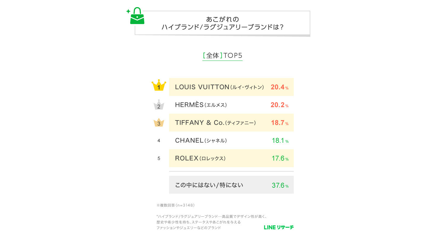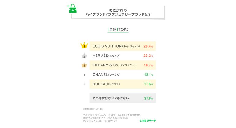 「LINEリサーチ」では、全国の15~69歳の男女を対象に、あこがれのハイブランド/ラグジュアリーブランドに関する調査をしたので、結果を紹介しよう。