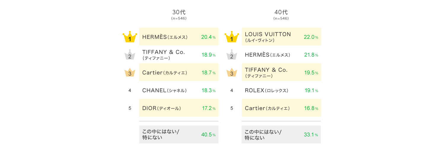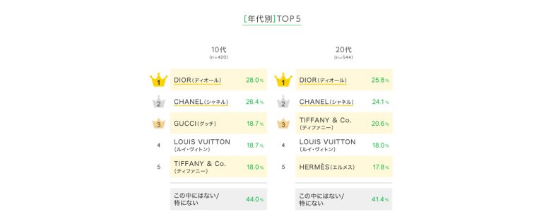 一方、女性は「TIFFANY & Co.」「HERMÈS」「CHANEL」がTOP3となった。「TIFFANY & Co.」「DIOR」「CHANEL」「Cartier(カルティエ)」は、特に女性のほうが高い割合となっている。