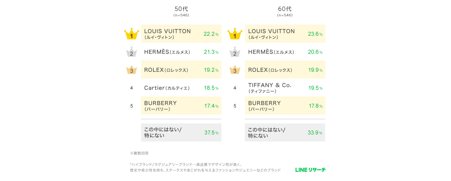 全体では、約2割のほぼ同率で「LOUIS VUITTON(ルイ・ヴィトン)」「HERMÈS(エルメス)」がTOP2に。