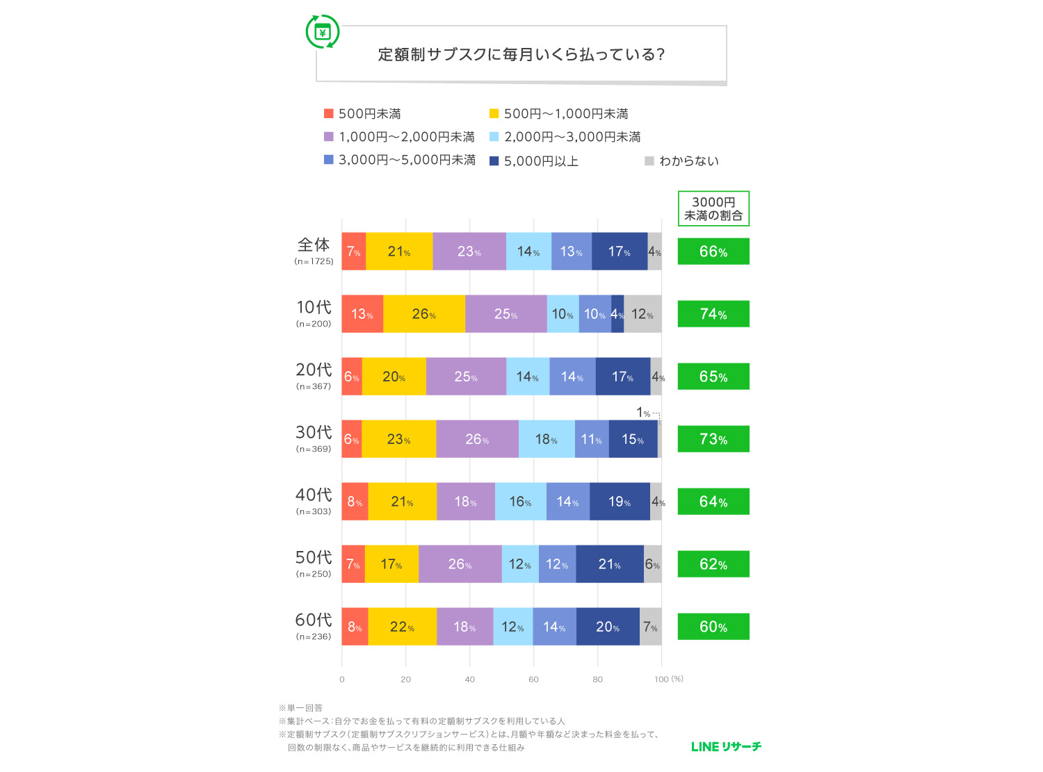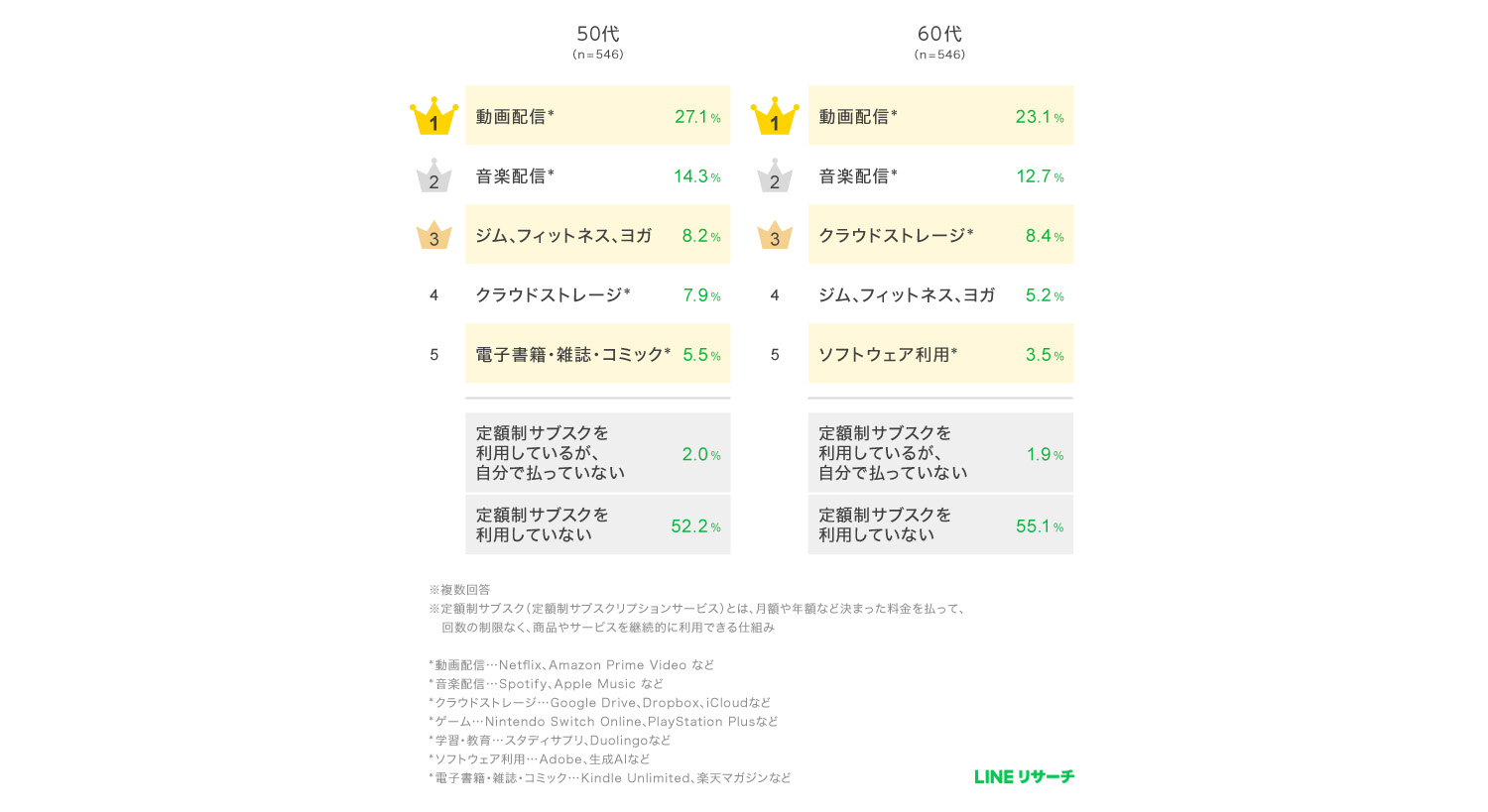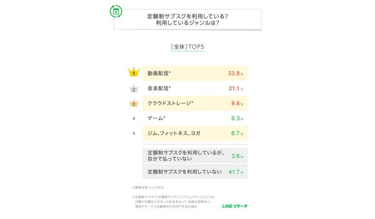 スマートフォン専用のリサーチプラットフォーム「LINEリサーチ」はこのほど、全国の15~69歳の男女を対象に、定額制サブスクリプションサービスの利用状況や、利用しているジャンル、毎月の支払金額に関する調査を実施し、その結果を発表した。
