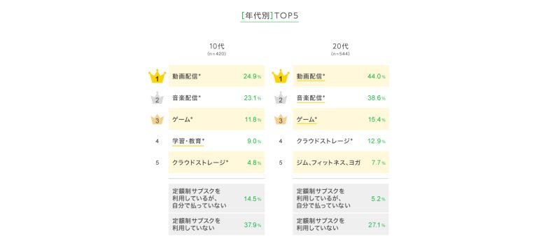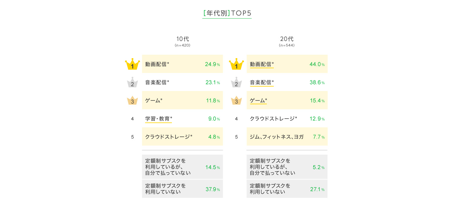 学生が多い10代では、「学習・教育」が4位に入った。20代以上では「ジム、フィットネス、ヨガ」も5位以内に入っている。
