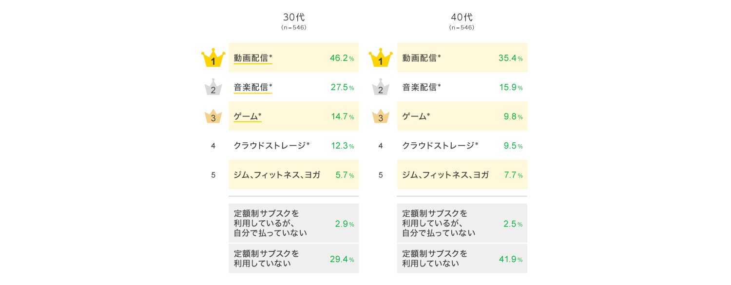 全体的にみると20~30代で、動画や音楽を中心とした定額制サブスクの利用率が最も高いことがわかった。