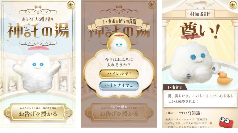 「今日はおふろに入れそうか?」という問いかけに対して「ハイレルヤ!」を選択すると、「ユ・ポポ」様のお告げ(ボイス)が全25種の中からランダムで流れる。自宅の給湯器がノーリツ製品でない人も、特設サイトより新キャラクターボイスを楽しめる。