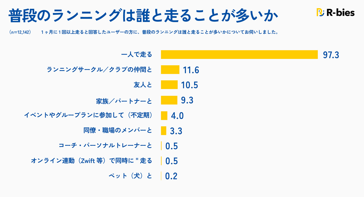 まず、ランニングをはじめたきっかけを聞いたところ、「マラソン大会や駅伝などイベント参加が決まって」と「体重の増加」がTOP2となった。続いて、普段誰と走ることが多いか聞いたところ、「一人で走る」がダントツでトップに。