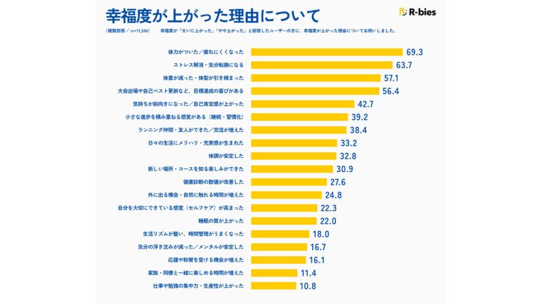 また、「ランニング仲間・友人ができた/交流が増えた」(38.4%)と「家族・同僚と一緒に楽しめる時間が増えた」(11.4%)などといった、コミュニティ促進も幸福度の重要な源泉となっていることが明らかに。