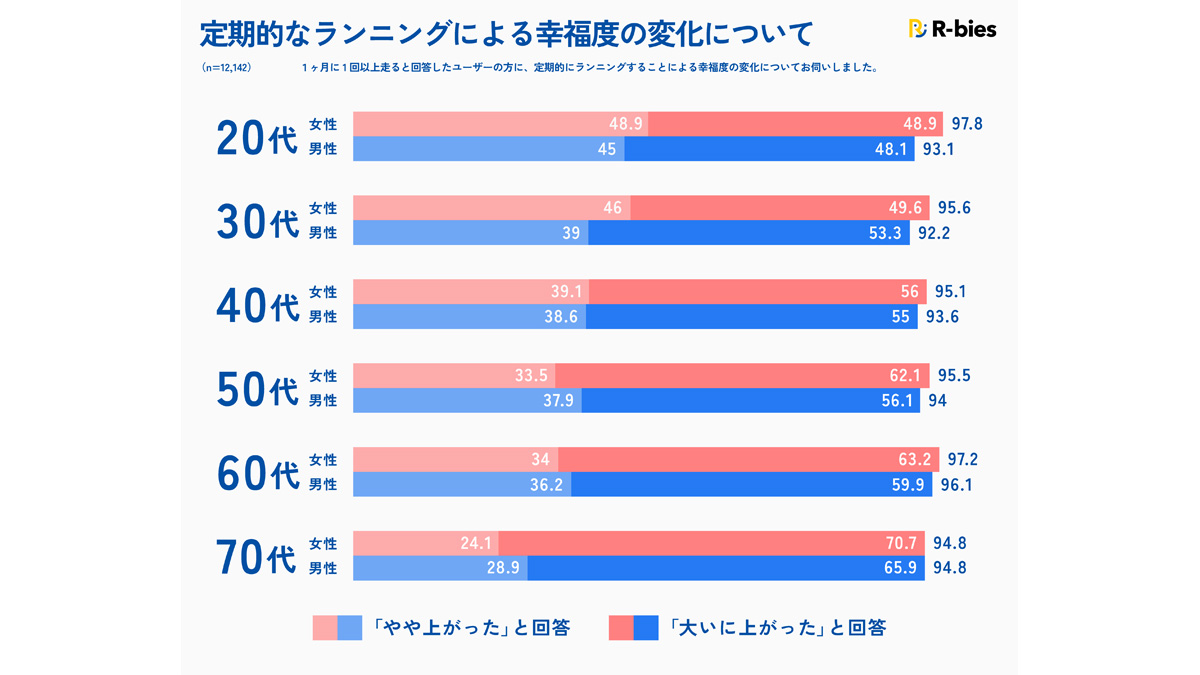 ランニングによる幸福度の変化を尋ねたところ、全体の94.6%(「大いに」57.3%、「やや」37.3%)が「上がった」と回答した。男女別でみると男性と比較して、どの年代別においても女性の方が幸福度の向上を実感したという割合が高いことが判明。