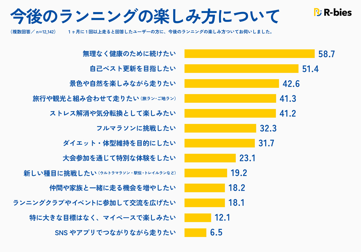 今後のランニングの楽しみ方(複数回答)については、「健康維持」(58.7%)、「自己ベスト更新」(51.4%)といった志向に加え、旅行や観光と組み合わせてランニングや大会に出場する「旅ラン」が4割以上、仲間や家族と一緒に走る機会を増やしたいも約2割と、新たな楽しみ方への関心も高く示された。