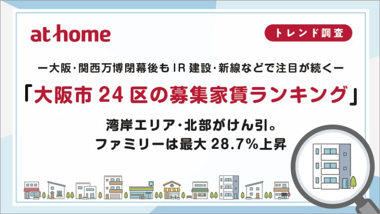 アットホームは、大阪市24区の2025年9月の募集家賃を2023年同月と比較し賃貸市場の変化を調査した「大阪市24区の募集家賃ランキング」の調査結果を発表したので、詳細をお伝えしよう。