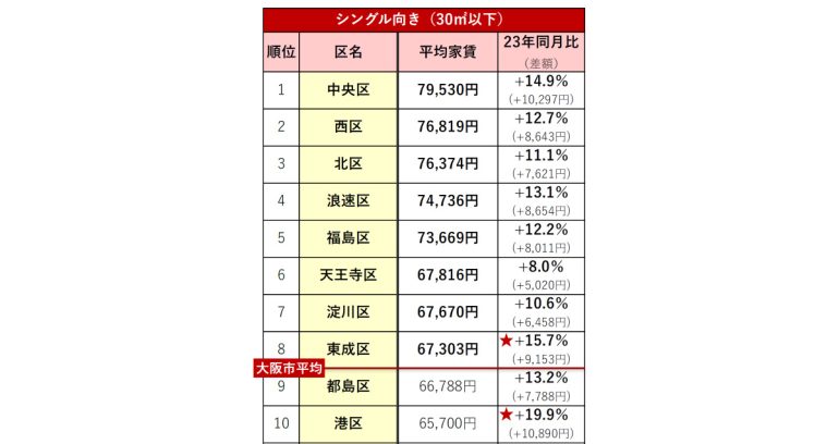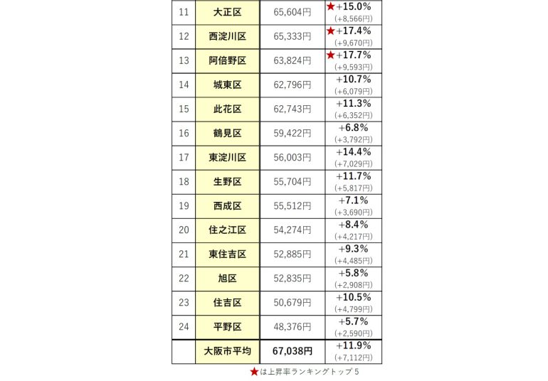 家賃水準が高いのは中央区・西区など大阪都心部で、平均家賃は7万円台後半。上昇率が高いのは港区・大正区・西淀川区など西部エリアや東成区など都心近隣エリアであった。