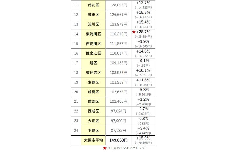 上昇率上位5区のうち、東成区を除く4区は大阪市平均家賃を下回る。港区は弁天町駅周辺の再開発が家賃上昇に影響しているようだ。西淀川区や大正区は、万博関連や建設従事者の滞在需要が家賃を押し上げていた。