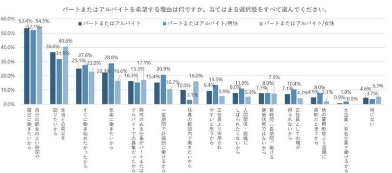 性別でみると男性のほうが女性よりも「気楽に働きたいから」が12.2ポイント、「一定期間で計画的に働けるから」が10.2ポイントも高かった。計画的に無理のない範囲での就労を希望する人が多い印象だ。