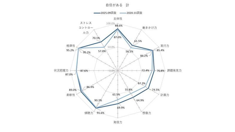 能力要素別では、「ストレスコントロール力」の「自信がある(「かなり自信がある」と「まあまあ自信がある」の合計)」は2020年11月調査時は57.0%だったが、2025年9月調査時は70.1%で13.1ポイントも高くなっている。
