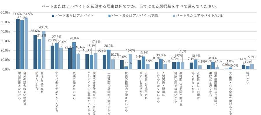 パート・アルバイトを希望する理由では、半数以上が「自分の都合のよい時間や曜日に働きたいから」と回答し、一方で正社員を希望する理由では、半数以上が「将来にわたって安定して働きたいから」と回答した。