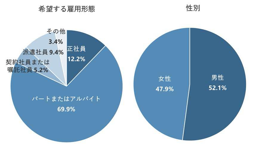 性別でみると男性のほうが女性よりも「気楽に働きたいから」が12.2ポイント、「一定期間で計画的に働けるから」が10.2ポイントも高かった。計画的に無理のない範囲での就労を希望する人が多い印象だ。