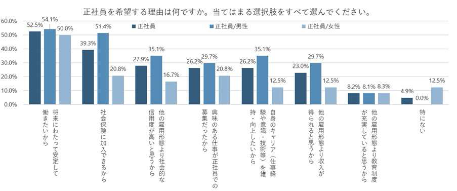 性別でみると男性のほうが女性よりも「社会保険に加入できるから」は30.6ポイント高く、「自身のキャリアを維持・向上したいから」も22.6ポイント高かった。さらに「ほかの雇用形態より社会的な信用度が高いと思うから」も18.4ポイントも高かった。女性のほうが5ptポイント以上高くなった項目はなかったという。