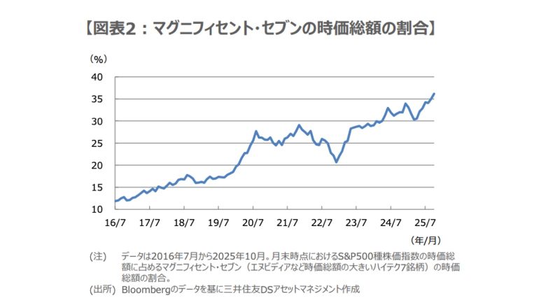 ただ、AI関連銘柄の人気は非常に高く、エヌビディアなど時価総額の大きいハイテク7銘柄の時価総額は、10月末時点でS&P500種株価指数の時価総額の36%を超えており(図表2)、これら7銘柄が調整すれば、市場全体に影響が及ぶ恐れがあるため、この点には注意が必要だ。