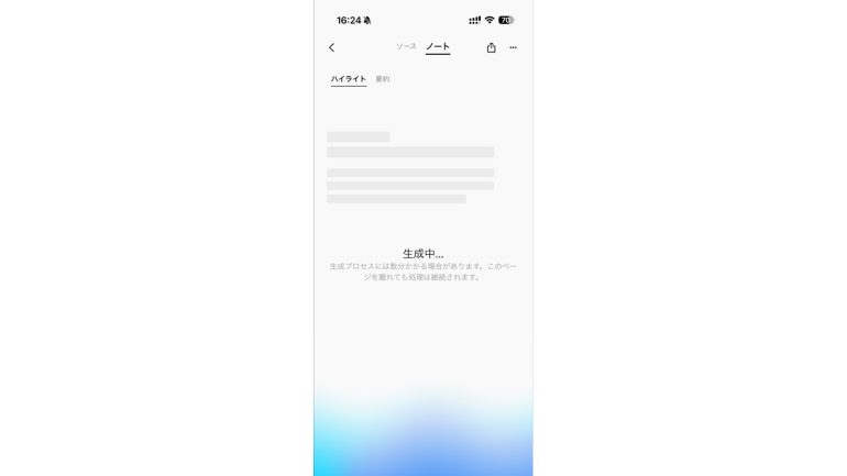 日本語で録音した音声をとりあえずテキスト化したい時には、複雑なことを考えず、自動生成を選べばいい。クリックしたあと、サーバー側で文字起こしや要約などが行われて、しばらくするとその結果が表示される。50分程度の音声で試したところ、2、3分の時間がかかったが、そこまで待たされる心配はない。