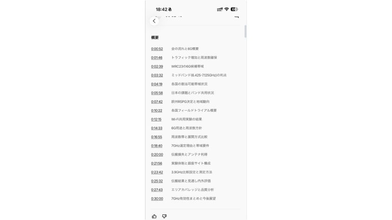 テキスト化が終わると、画面上には「録音ハイライト」が表示され、中身の概要が示される。今回試したのは、ソフトバンクとノキアが6Gの周波数として7GHz帯を使う実証実験をした際のイベントを録音したものだったが、ハイライトだけでも、かなりその中身が正確であることが分かる。「要約」タブをタップすると、順を追って何が話されたかを解説してくれるため、ほぼここだけで内容が分かってしまう。