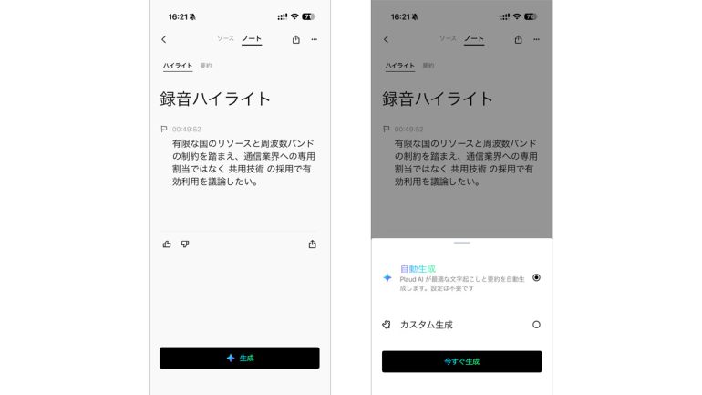 録音した音声はいったんペアリングしたスマホ側に転送される。その状態で、「生成」ボタンをタップすると、テキスト化を行える。生成時には、「自動生成」と「カスタム生成」を選択可能。自動生成は、文字起こしだけでなく、要約の作成などまでまとめて行うためのもの。カスタム生成を選ぶと、テンプレートの選択や話者ラベルの有無、AIモデルや言語などを手動で選択できる。