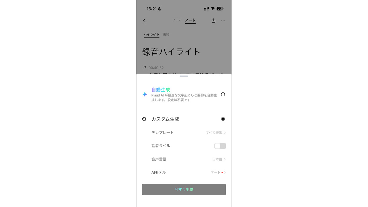 録音した音声はいったんペアリングしたスマホ側に転送される。その状態で、「生成」ボタンをタップすると、テキスト化を行える。生成時には、「自動生成」と「カスタム生成」を選択可能。自動生成は、文字起こしだけでなく、要約の作成などまでまとめて行うためのもの。カスタム生成を選ぶと、テンプレートの選択や話者ラベルの有無、AIモデルや言語などを手動で選択できる。