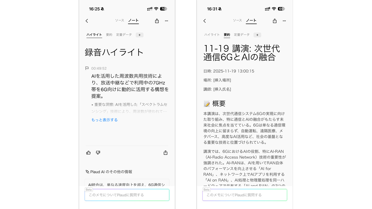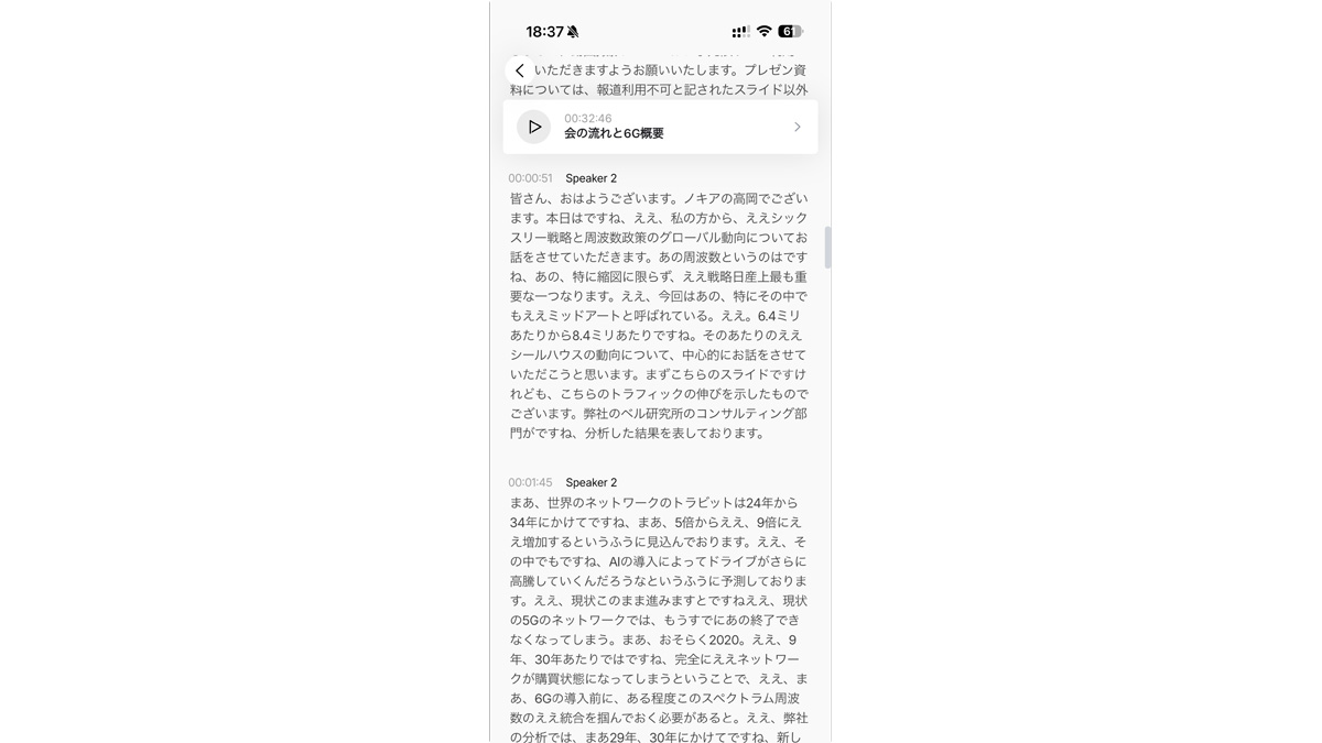 テキスト化が終わると、画面上には「録音ハイライト」が表示され、中身の概要が示される。今回試したのは、ソフトバンクとノキアが6Gの周波数として7GHz帯を使う実証実験をした際のイベントを録音したものだったが、ハイライトだけでも、かなりその中身が正確であることが分かる。「要約」タブをタップすると、順を追って何が話されたかを解説してくれるため、ほぼここだけで内容が分かってしまう。