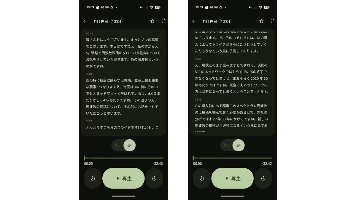 試しに、Pixel 10で録音した同じ部分と見比べてみたが、「ミッドバンド」や「ミットマット」、「収容」はやはり「終了」になっていたものの、「トラフィック」はきちんと「トラフィック」になっていた。間違える箇所の傾向は近い。ただし、どちらも大元の話を聞いていれば間違いから推測して復元は可能。取りこぼしも少ないため、手動で頭から文字起こししていく時間は大幅にカットできる。