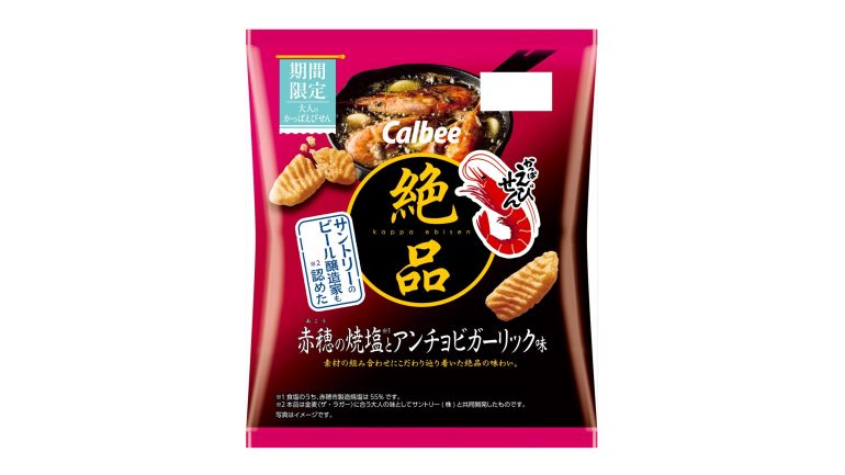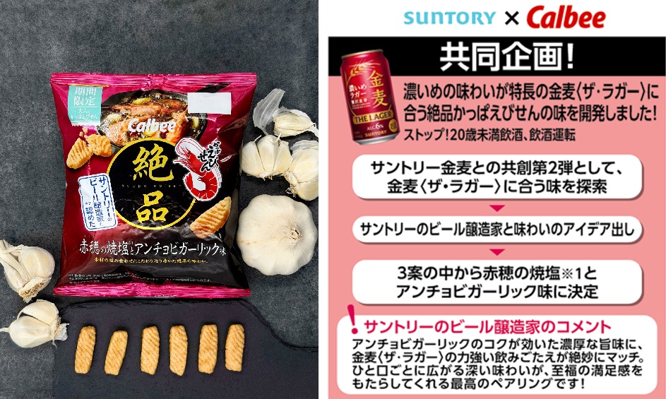 カルビーは、お酒のおつまみ向けとして素材の組み合わせにこだわった「絶品かっぱえびせん」シリーズより、サントリーと共同開発した「絶品かっぱえびせん 赤穂の焼塩とアンチョビガーリック味」を2025年12月1日から全国で期間限定発売する(2026年5月中旬終売予定)。