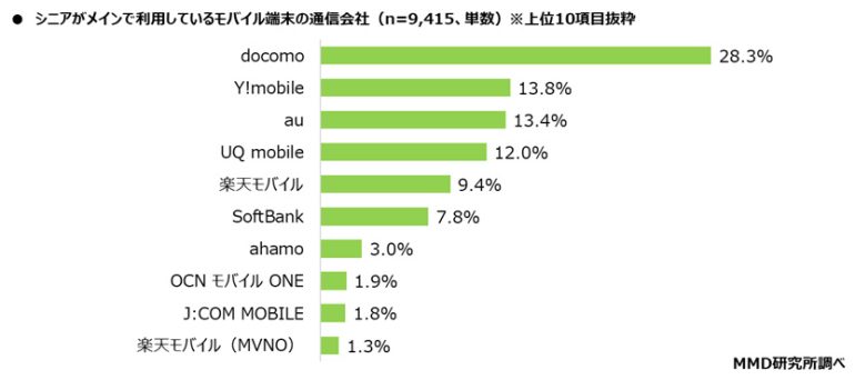 60歳~79歳のモバイル端末を所有している9,471人のうち、通信契約しているモバイル端末所有の9,415人を対象に、メインで利用しているモバイル端末の通信会社を聞いたところ、「docomo」が28.3%と最も多く、次いで「Y!mobile」が13.8%、「au」が13.4%。