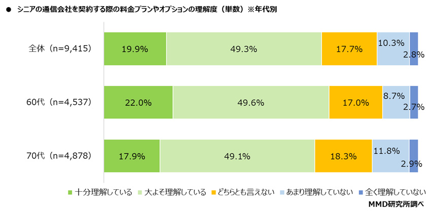 通信契約しているモバイル端末所有の9,415人を対象に、通信会社を契約する際の料金プランやオプションを理解しているか聞いたところ、「十分理解している」が19.9%、「大よそ理解している」が49.3%となり、理解しているのは69.2%であった。