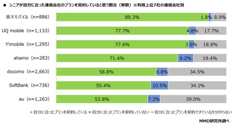 次に、利用上位7社の通信会社を利用している人を対象に、自分に合った通信会社のプランを契約していると思うか聞いたところ、「自分に合ったプランを契約している」と回答した割合が最も高いのは楽天モバイル(n=886)で89.3%。