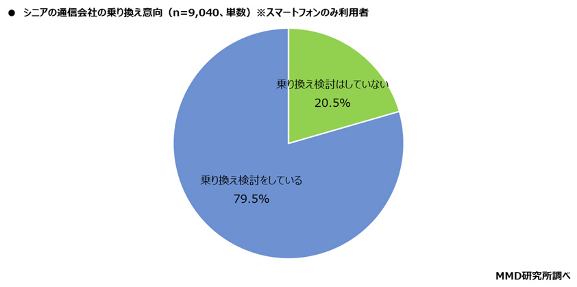 通信契約しているスマートフォンのみ利用者の9,040人を対象に、現在利用している通信会社からの乗り換え検討について聞いたところ、「乗り換えを検討している」は20.5%となった。