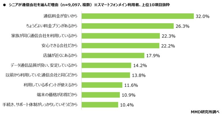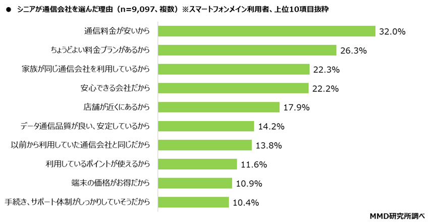 通信契約しているスマートフォンメイン利用者の9,097人を対象に、通信会社を選んだ理由を聞いたところ、「通信料金が安いから」が32.0%と最も多くなっていた。
