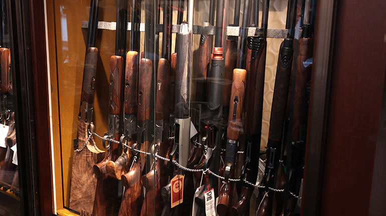 応対に出たのは、濵﨑銃砲火薬店の次期代表、濵﨑航平(はまさきこうへい)さん。同店は、滋賀県でも数少ない銃器を取り扱うショップで、ガラス張りの棚には実銃が所狭しと陳列されている。