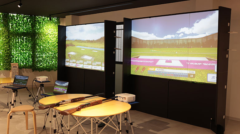 さて、「クレーシューティングシミュレーター」は、店の上の階にあるという。上がってみると、広々とした空間に、2台のプロジェクターが置かれ、大きなスクリーンにクレー射撃場のCGが映し出されている。