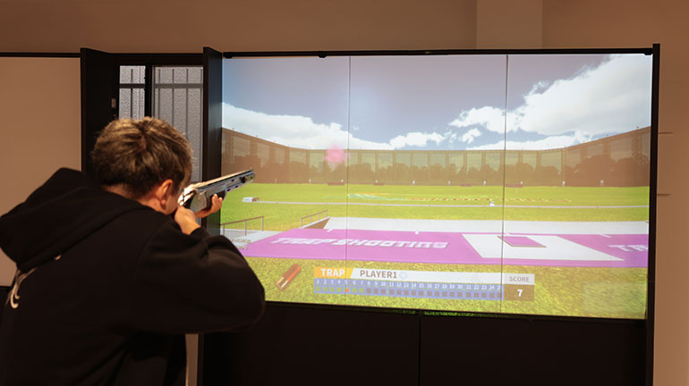 設定が終わったら、射撃できます。リアルの競技と同じく掛け声を発すると、マイクがその声を拾ってクレーが射出されます。それを狙って引き金を引くだけです」