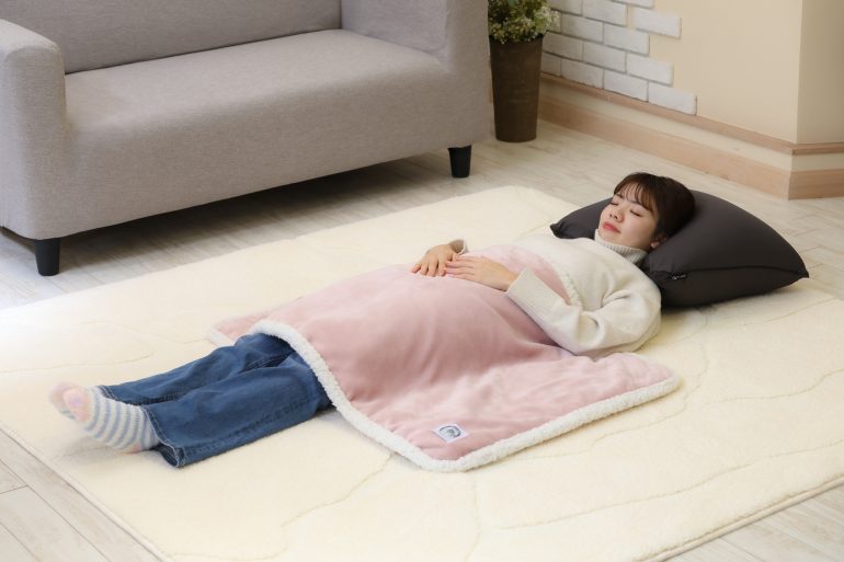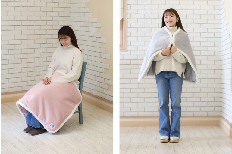 また、シーンに合わせて使い分けられる、3WAY仕様なのも嬉しいポイント。ひざ掛けとして使用できるのはもちろん、本体の長辺に付いたボタンを留めることで、肩から羽織ることが可能。さらに、お昼寝時などにおなかを温めるブランケットとしても活躍する。