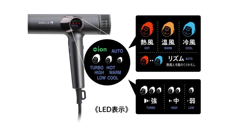 さらに、温度と風量は、本体側面のインジケーター部分にゴリラの顔アイコンでわかりやすく表示される。温度は、熱風が赤、温風がオレンジ、冷風が青に光り、熱風と冷風が自動で切り替わるリズムモードでは赤と青が交互に点灯。風量は、強=3匹、中=2匹、弱=1匹とゴリラの数で表示される。