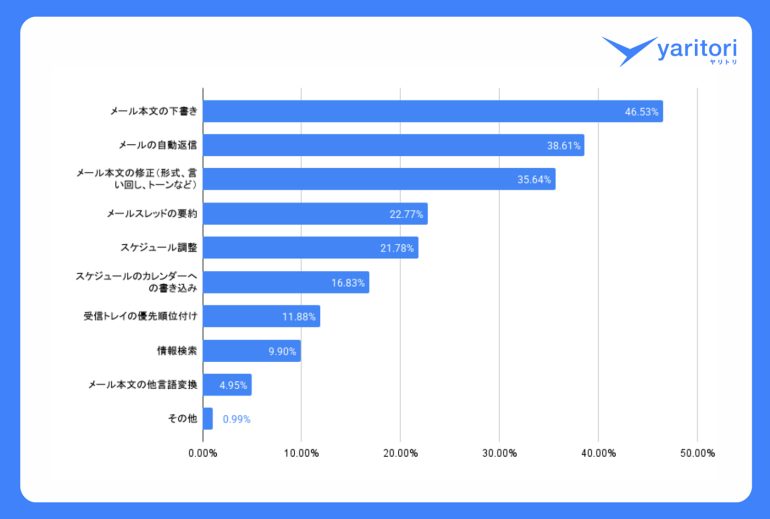 具体的なAIの用途では、「メール本文の下書き」、「メールの自動返信」、「メール本文の修正」が上位だった。メール対応に必要な一連のタスクのなかで、とくに多くの時間を使う「メール本文の作成」についてはAI活用が進んでいるようだ。