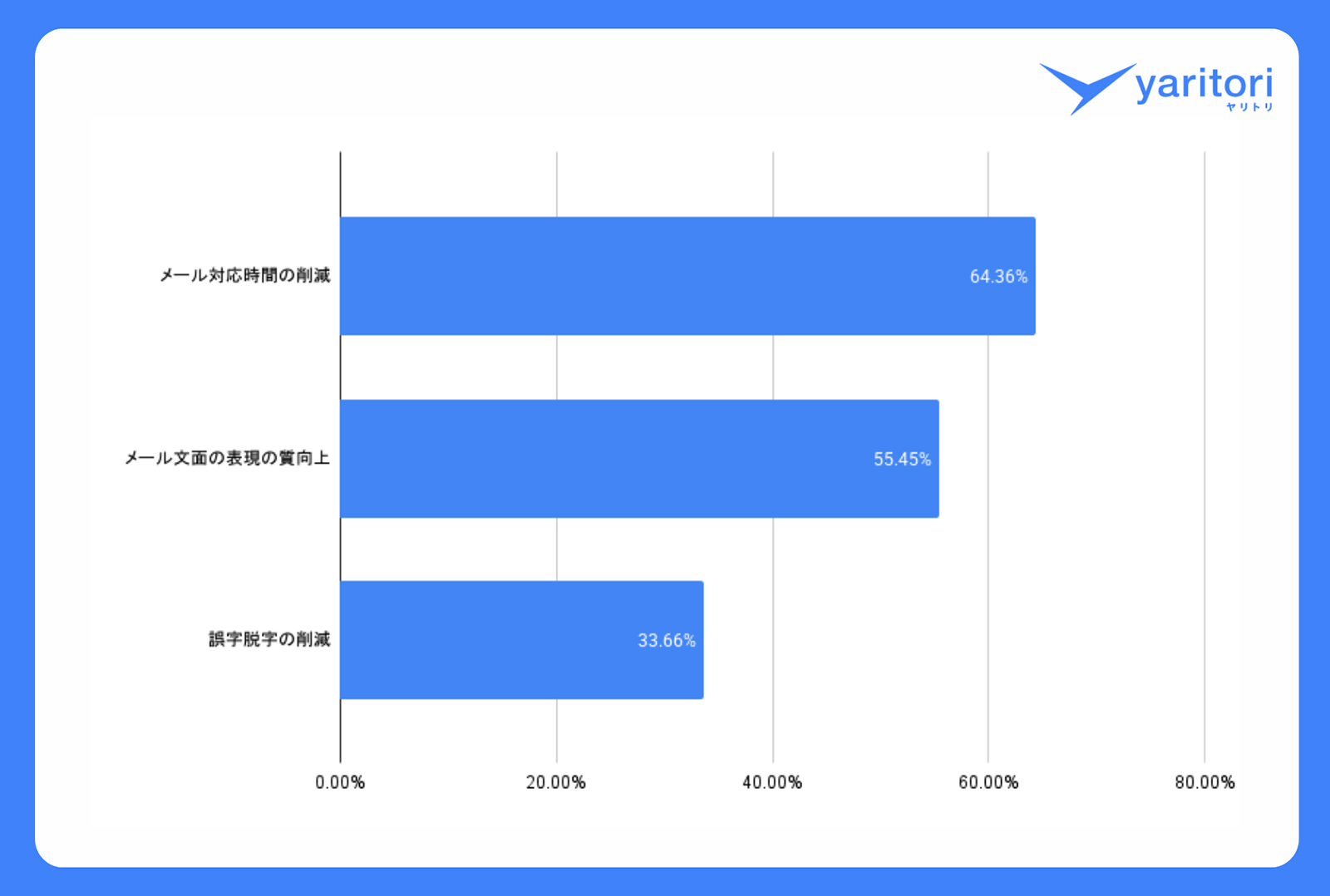AI活用をしている人からは、メリットとして「メール対応時間の削減」、「メール文面の表現の質向上」、「誤字脱字の削減」などが挙がった。