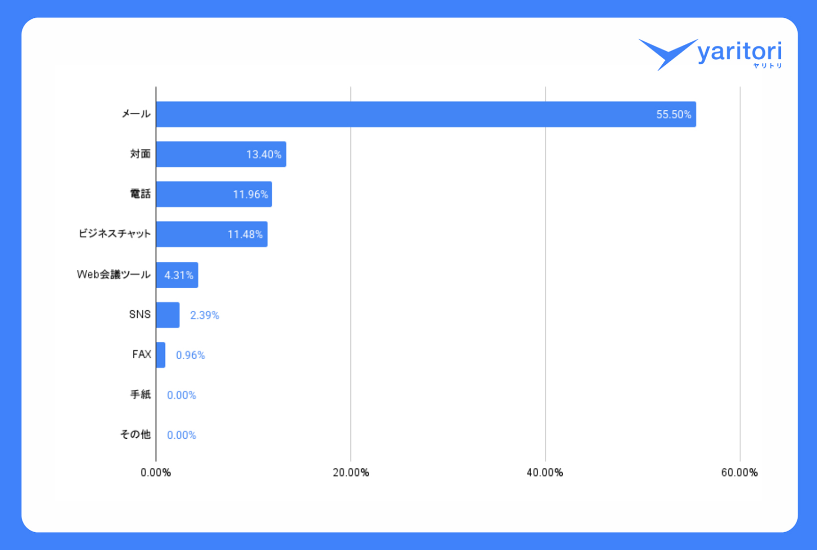 今回の調査では、仕事上でよく利用しているコミュニケーション手段でもっとも多かった回答は「メール」だった。普段からメールを使っているビジネスパーソンは約7割で、そのうち一番利用するコミュニケーション手段としてメールを挙げた人は55.5%だった。