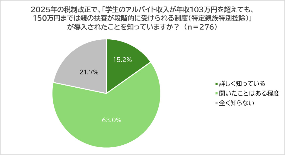 次に、「2025年の税制改正『特定親族特別控除』を知っているか?」を尋ねたところ、「詳しく知っている」は15.2%、「聞いたことはある程度」が63.0%と、約8割(78.2%)が認識していることがわかった。