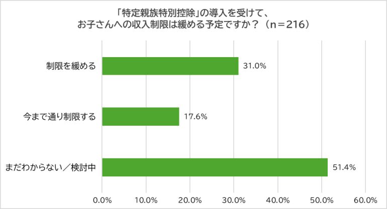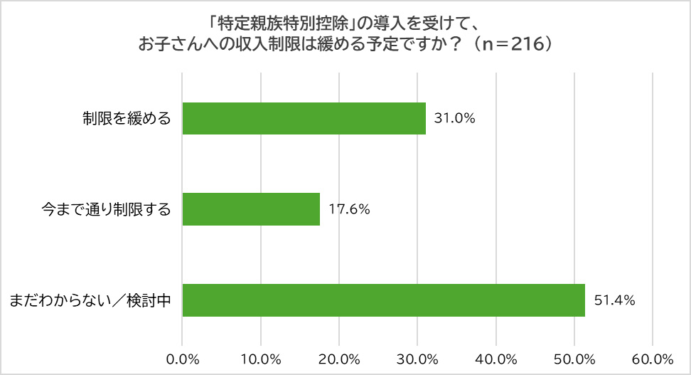 続いて、認識していると回答した親に「『特定親族特別控除』の導入を受けて、子供の収入制限を緩める予定か?」と尋ねたところ、「制限を緩める」は31.0%にとどまり、半数以上(51.4%)が「まだわからない/検討中」と回答した。