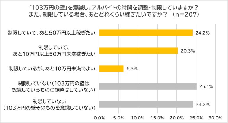 今度は、19歳以上23歳未満のアルバイトをしている学生に「『103万円の壁』を意識し、アルバイトの時間を調整・制限しているか?また、あとどのくらい稼ぎたいか?」と尋ねたところ、半数(50.8%)の学生が「壁を意識して収入を制限」しており、24.2%が「あと50万円以上稼ぎたい」と答えた。