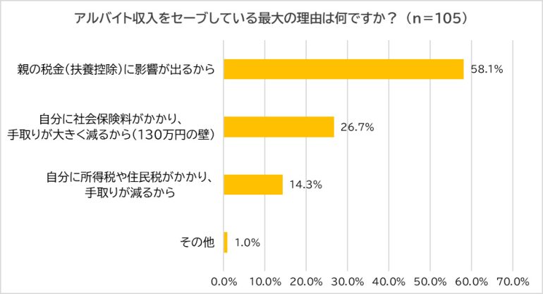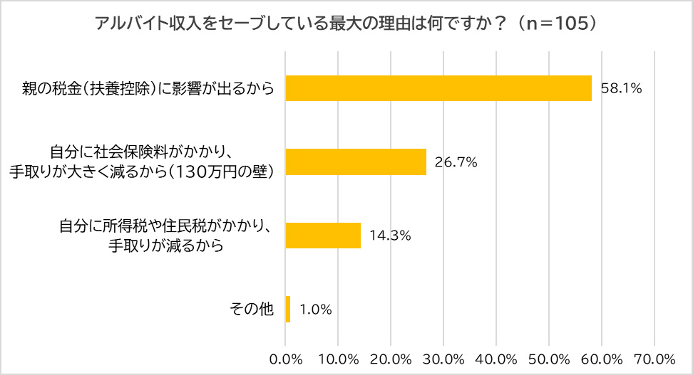 壁を意識して収入を制限していると答えた学生に「アルバイト収入をセーブしている最大の理由」を尋ねたところ、最も多かったのは「親の税金(扶養控除)に影響が出るから」(58.1%)となった。