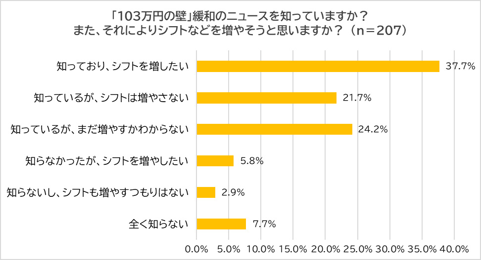 最後に、「『103万円の壁』緩和のニュースを知っているか?また、それにより働き方に変化はあるか?」尋ねた。その結果、37.7%が税制改正を「知っており、シフトを増やしたい」と回答し、「知らなかったが、増やしたい」(5.8%)も含めると、4割超(43.5%)の学生が働いて収入を増やしたいと思っていることがわかった。