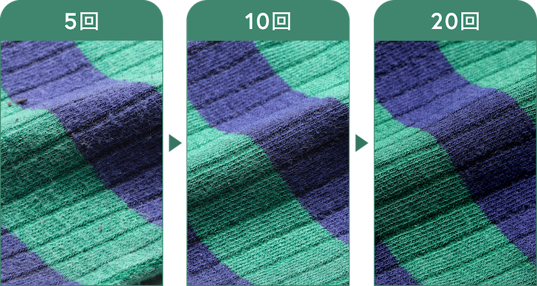 洗濯試験は毛玉付きの生地をつくるところからスタート。生地ごとに洗濯回数を変え、毛玉や毛羽立ちの減少を確認していった。「1日中洗濯しなければならないので、開発担当者は洗濯試験を行なう際、社内にある洗濯機から離れらないほどでした」と小林さんは明かす。