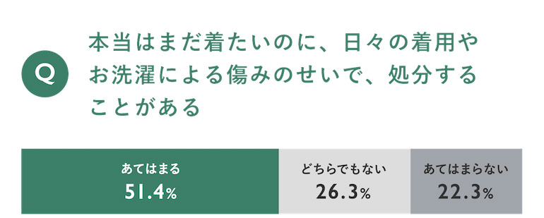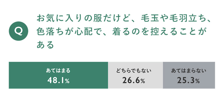 服は洗濯回数が増えるにつれて劣化していく。そこで、洗濯洗剤を購入し自身で使用している20~60代男女を対象に、2023年11月に「衣類/衣類ケアに関する調査」を実施(n=1215)。「本当はまだ着たいのに、日々の着用やお洗濯による傷みのせいで、処分することがある」の設問に半数以上の51.4%が「あてはまる」と回答したほか、「お気に入りの服だけど、毛玉や毛羽立ち、色落ちが心配で、着るのを控えることがある」の設問では約半数に当たる48.1%が「あてはまる」と回答している。