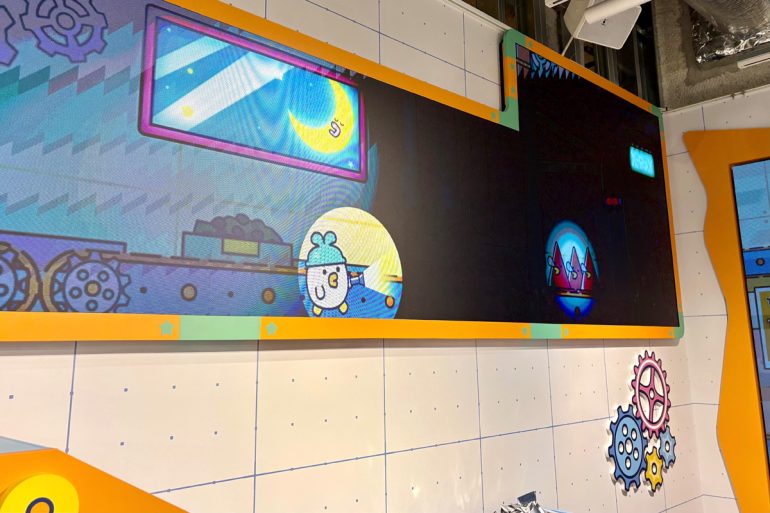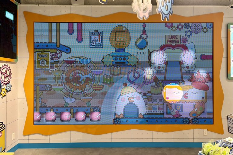 店内に入ると、壁一面に大きなLEDモニターが。ここでは「たまごっち」を製造する〝ふぁくとり~〟の様子をオリジナルサウンドとともに楽しめる。工場がフル稼働する姿のほか、工場が閉まったあとの夜の見回りや、トラブルを復旧するまで奮闘する様子が見られることもあるそうだ。